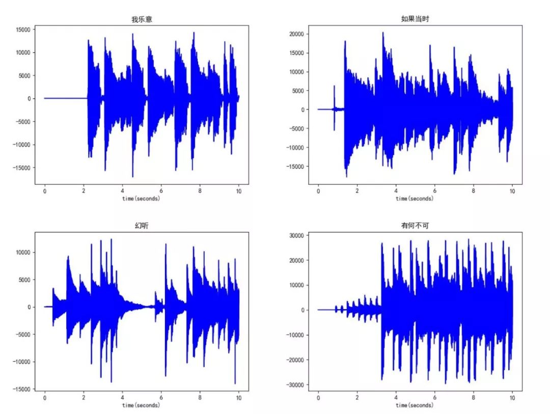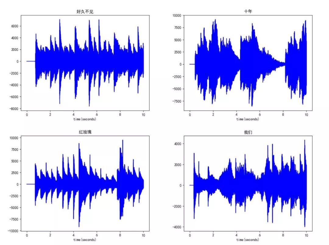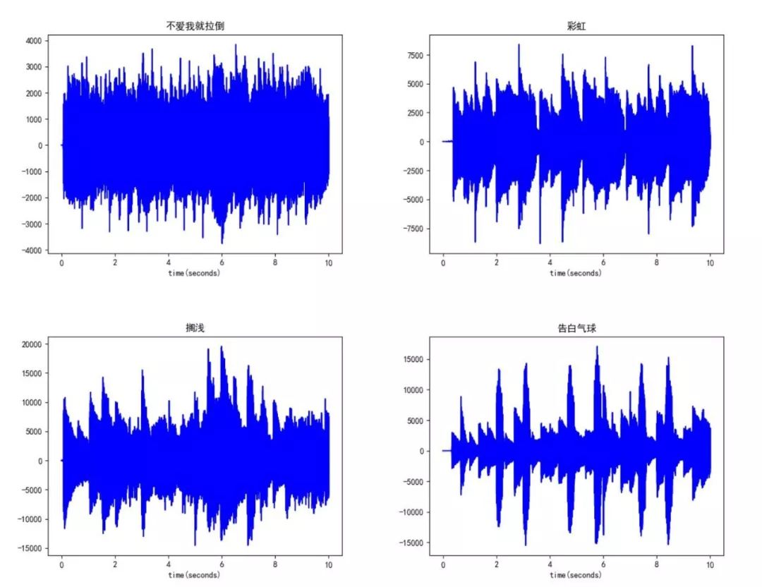 感觉波形图好混乱,似乎是数据量太大引起的,于是我打算换一个策略,只画出每首歌曲前10秒的波形图来作比较,毕竟良好的开端是成功的一半?