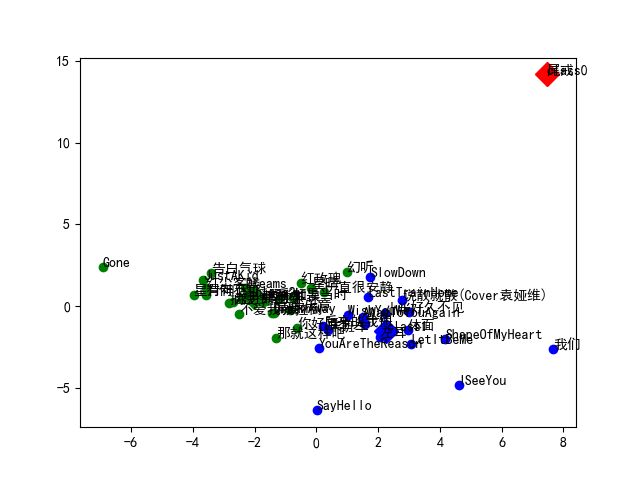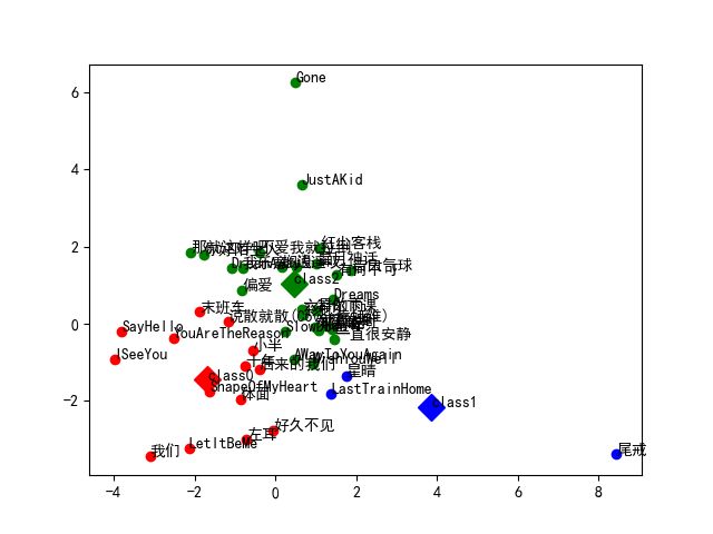 综上所述,我们已经获得了歌曲的42个特征值。下面我们尝试利用这些特征值对我这几天下载的43首歌曲进行k均值聚类。首先,为了便于结果的可视化,我们利用PCA对数据进行降维(42维特征到2维特征),为了方便起见,我们直接调库(sklearn)实现,结果打印如下: