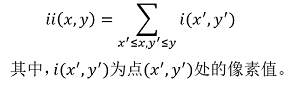下面我们来考虑一下如何计算矩形的特征值。对图像中的任意一点A(x, y),定义该点的积分图为其左上角的所有像素值之和,即: