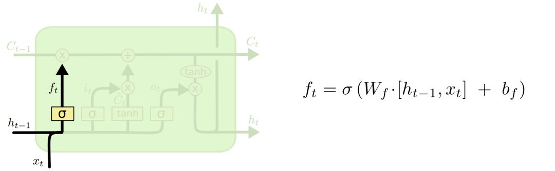 首先,LSTM需要决定哪些信息需要丢弃,哪些信息需要保留。这是通过一个叫做遗忘门的sigmoid层来实现的。它的输入是ht-1和xt,输出是一个数值都在0到1之间的向量,表示Ct-1中各部分信息的权重,0表示不让该部分信息通过,1表示让该部分信息全部通过。