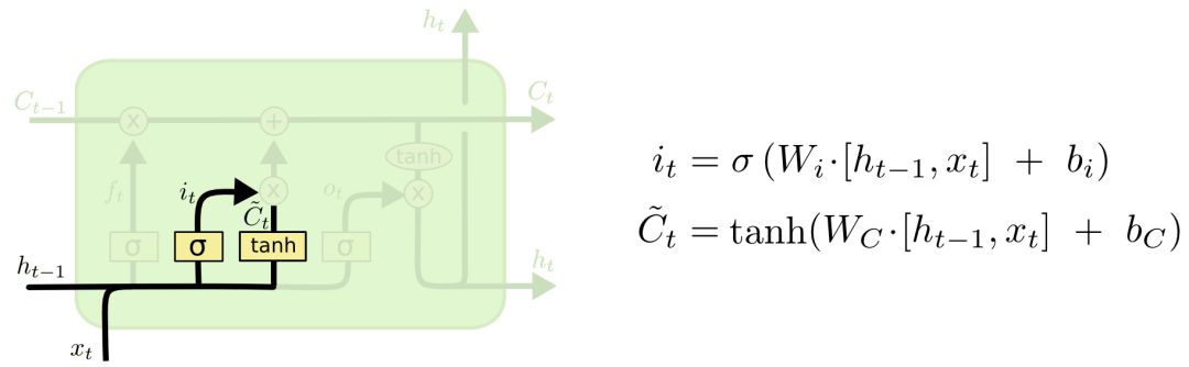 其次,LSTM将决定让哪些新的信息加入到cell的状态中来。该实现分两个步骤进行:
