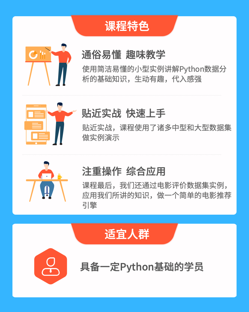 课程从Python控制、处理、整理和分析结构化数据的基本知识讲起,通过一些实践案例,让同学们学会利用各种Python库,高效的解决各式各样的数据分析问题,形成有效的结论和解决方案。