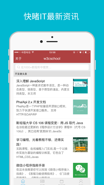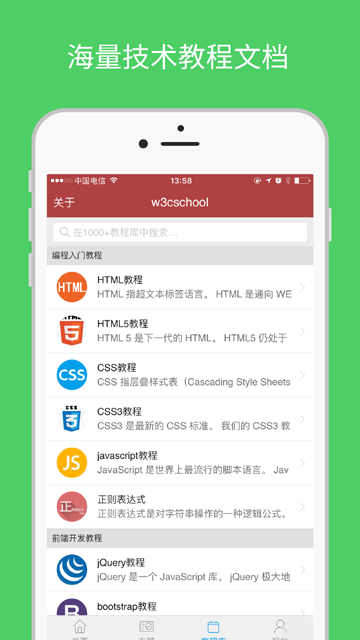 除此之外,在阅读体验方面,w3cschool app教程库含有1000本教程手册,含有编程入门教程、数据库开发教程、前端开发教程、服务器端开发教程等。