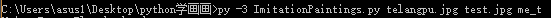 运行所提供的ImitationPaintings.py文件,格式为python ImitationPaintings.py+待转化图片路径+模板图片路径+生成图片保存路径加名称(注意不需要有.jpg等后缀),例如: