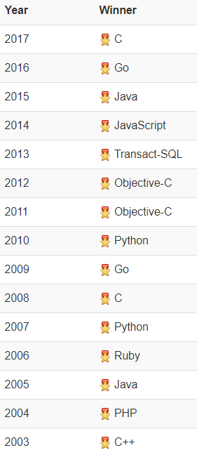 “年度编程语言”获奖名单如下图所示,该奖项授予一年中评分最高的编程语言: