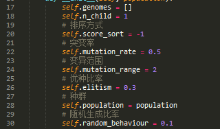 若效果不佳,请自行修改NeuroEvolution.py文件中相关参数,如下图所示: