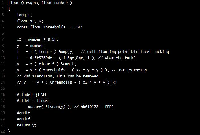 我们知道,越底层的函数,调用越频繁。3D引擎归根到底还是数学运算。那么找到最底层的数学运算函数(在game/code/q_math.c), 必然是精心编写的。里面有很多有趣的函数,很多都令人惊奇,估计我们几年时间都学不完。在game/code/q_math.c里发现了这样一段代码。它的作用是将一个数开平方并取倒,经测试这段代码比(float)(1.0/sqrt(x))快4倍: