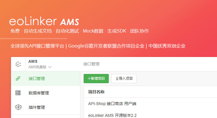 eoLinker API Management System(AMS)帮助企业开发人员进行在线管理接口文档、进行自动化测试、团队协作的工具,它旨在提高企业项目的接口管理水平,提升开发速度并且降低运维成本。